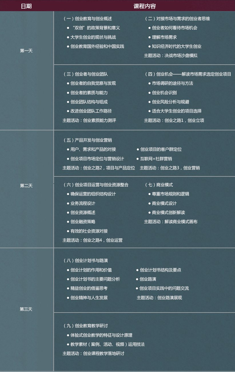●  培训讲师身为资深企业教练与创业教育专家,具有多年企业管理和创业经验,可保证课程的实际性和落地性;