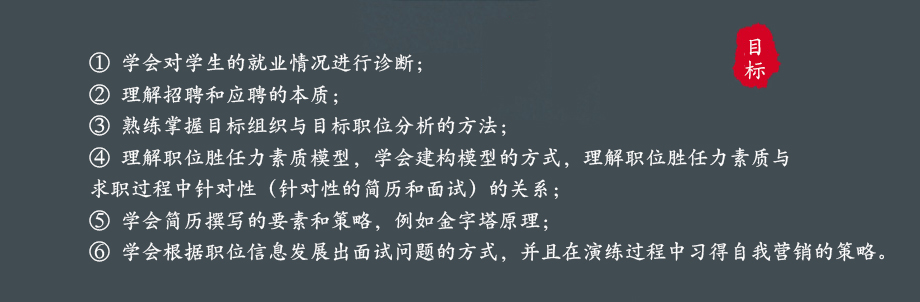 从能力提升的角度来说,这样的辅导流程不仅仅只针对于求职过程本身,而是可以帮助候选人/大学生学习到胜任力素质模型、关键词分析、金字塔原理、STAR原则、5W2H等应用理念及策略,也能学习到目标定位、信息的搜集与分析、自我营销等技能。求职应聘不是知识,而是技巧,因此演练为主。