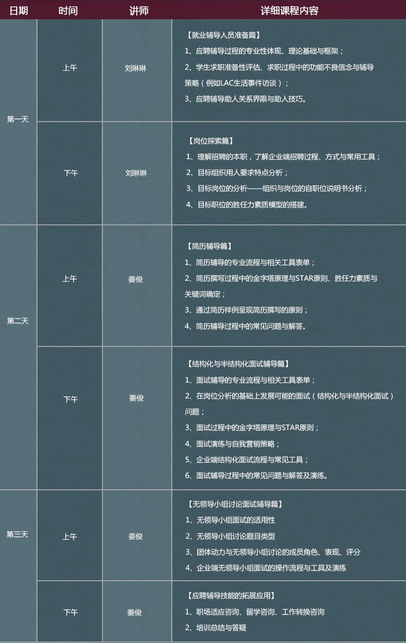 ● 以用人单位需求分析、企业人力招聘流程分析为基础,让高校老师迅速洞悉职场,了解企业人力资源的校园招聘流程,掌握专业系统的生涯辅导技术;