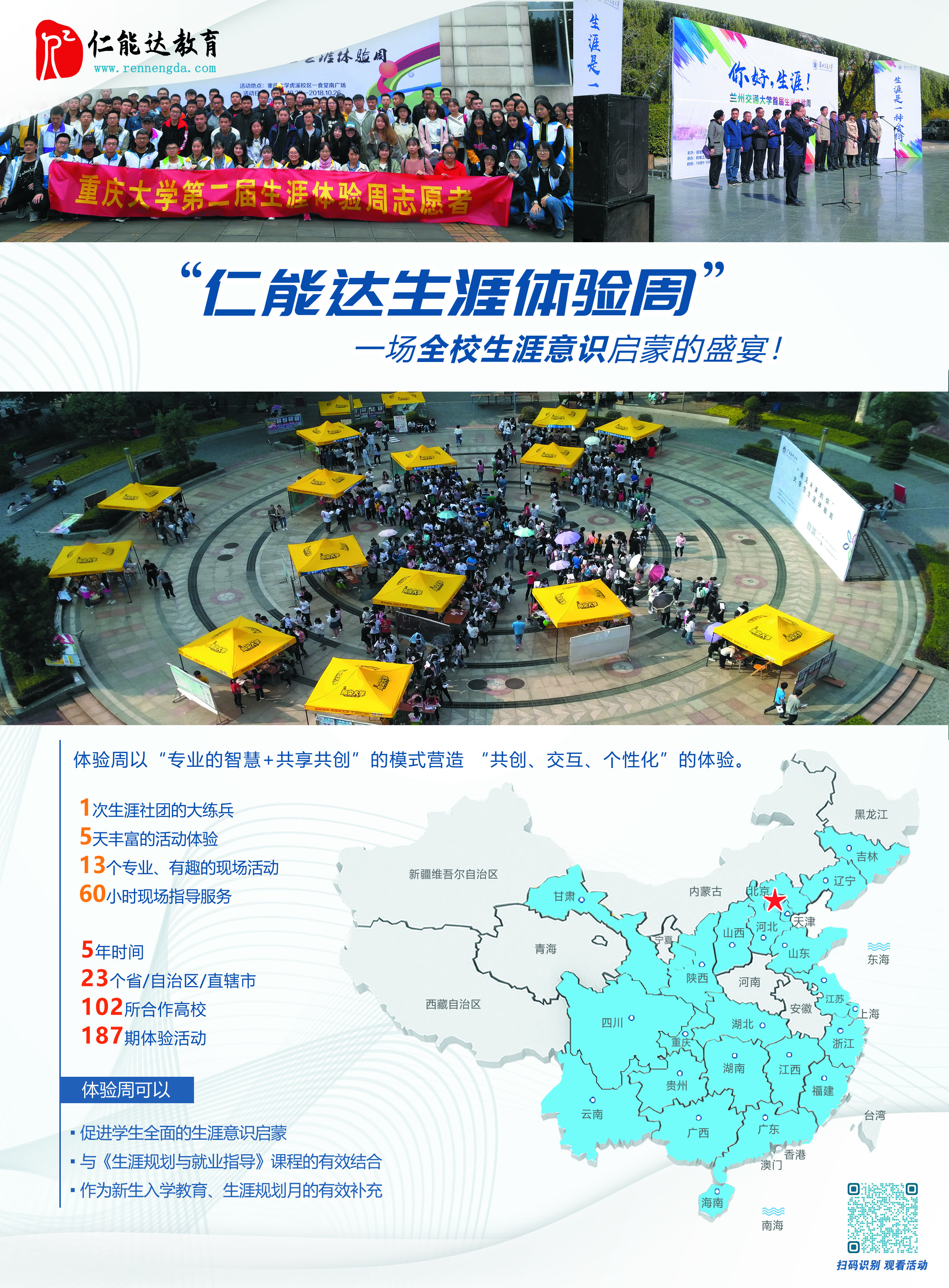 大学生生涯体验周,是由北京仁能达教育首创并独立研发的生涯意识启蒙类大型活动。是在一周5天的时间里,为校内2000-5000名学生提供可直接参与、有所体验、激发行动的活动,让学生在体验活动中触摸生涯,推动职业生涯规划的普及与深入认知。